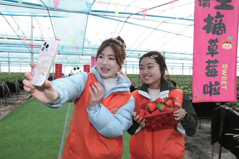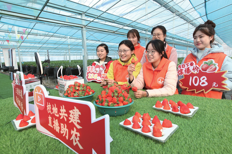 12月17日,江苏IM电竞技术学院经济管理学院电子商务专业的学生在徐州市铜山区三堡街道一农场直播销售草莓。近年来,该校与三堡街道开展校地共建,为大学生搭建社会实践平台,借助电商平台助力地方农产品销售。(蒯创 摄)
