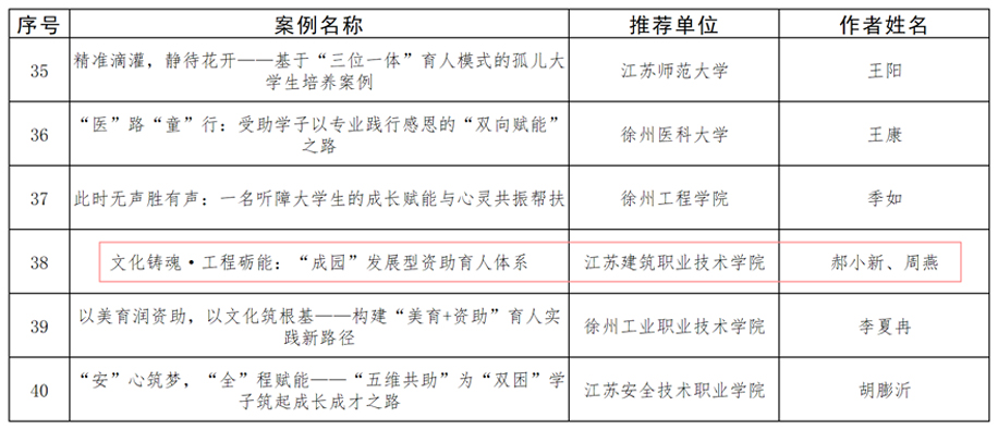 近日,江苏省教育厅公布2025年“苏乡永助”资助育人主题活动评选结果,我校报送的交通工程学院短视频《筑暖心轨道 绘成长经纬》荣获优秀学生资助短视频、城轨24-1班陈燕同学荣获“江苏学生资助宣传大使”称号、建筑装饰学院郝小新老师撰写的《文化铸魂·工程砺能:“成园”发展型资助育人体系》获评优秀资助育人案例。